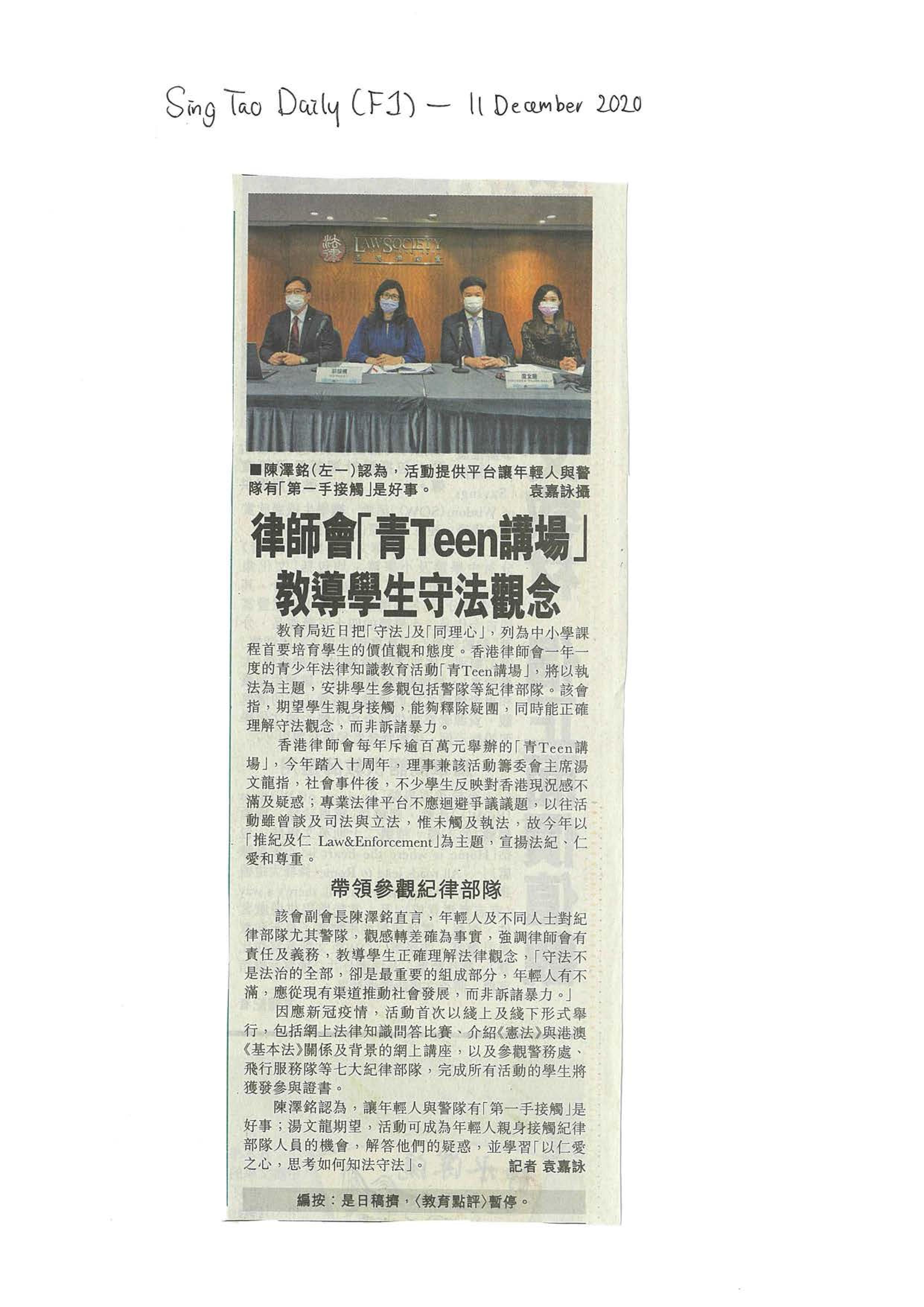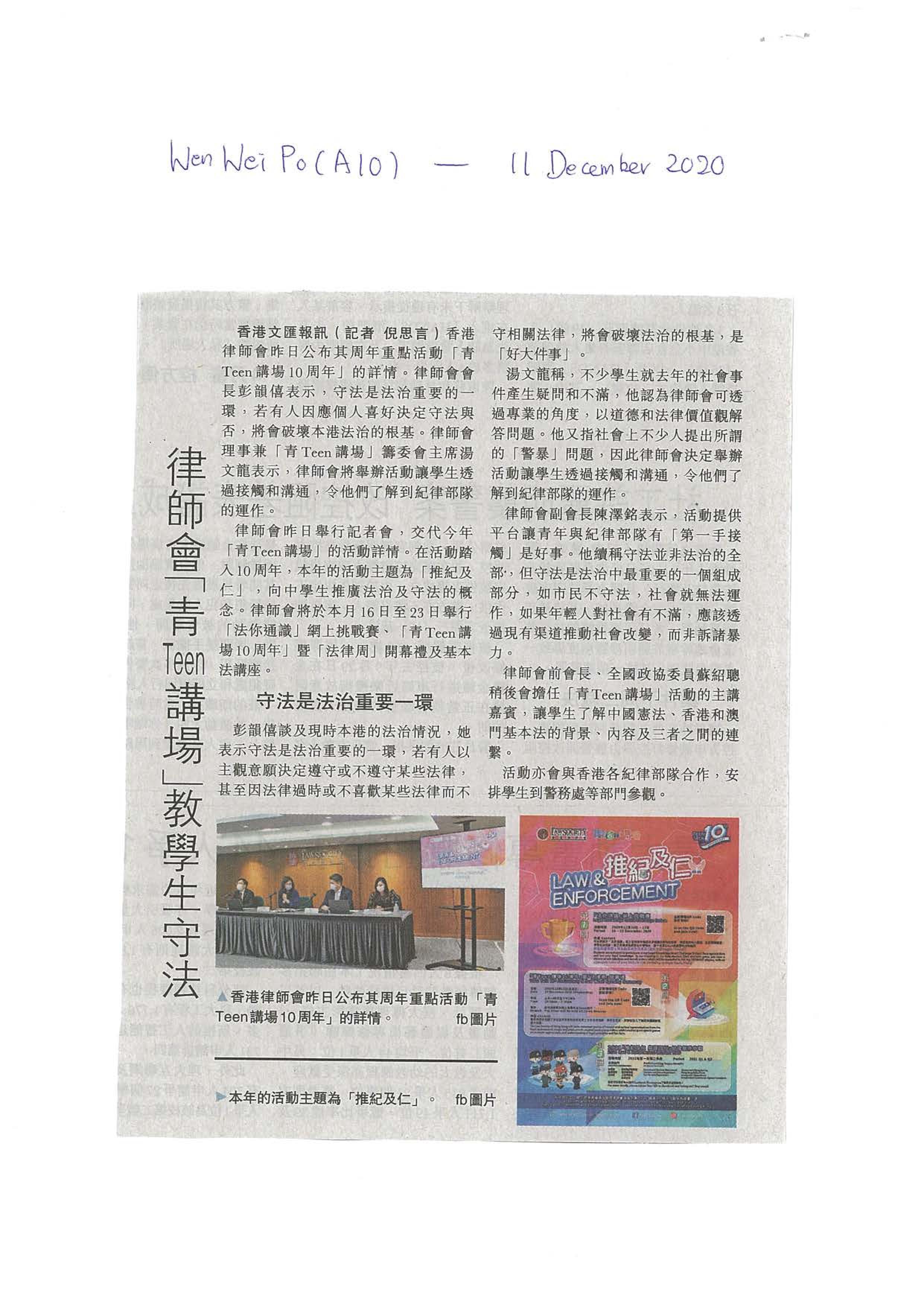 1 即 時 發 布 2 0 2 0 年 1 2 月 2 4 日 「 青 T e e n T e e n 講 場 1 0 周 年 」 暨 「 法 律 周 」 暨 「 法 律 周 」 暨 「 法 律 周 」 暨 「 法 律 周 網 上 開 幕 禮 順 利 舉 行 順 利 舉 行 主 禮 嘉 賓 與 全 港 中 學 生 網 上 同 框 中 學 生 網 上 同 框 《 基 本 法 》 講 座 及 問 答 比 賽 反 應 熱 烈 由 香 港 律 師 會 舉 辦 的 「 青 T e e n T e e n T e e n T e e n 講 場 1 0 周 年 」 暨 「 法 律 周 」 開 幕 禮 已 於 2 0 2 0 年 1 2 月 2 3 日 順 利 舉 行 。 開 幕 禮 史 無 前 例 於 網 上 會 議 平 台 Z O O M 進 行 , 並 邀 請 ...