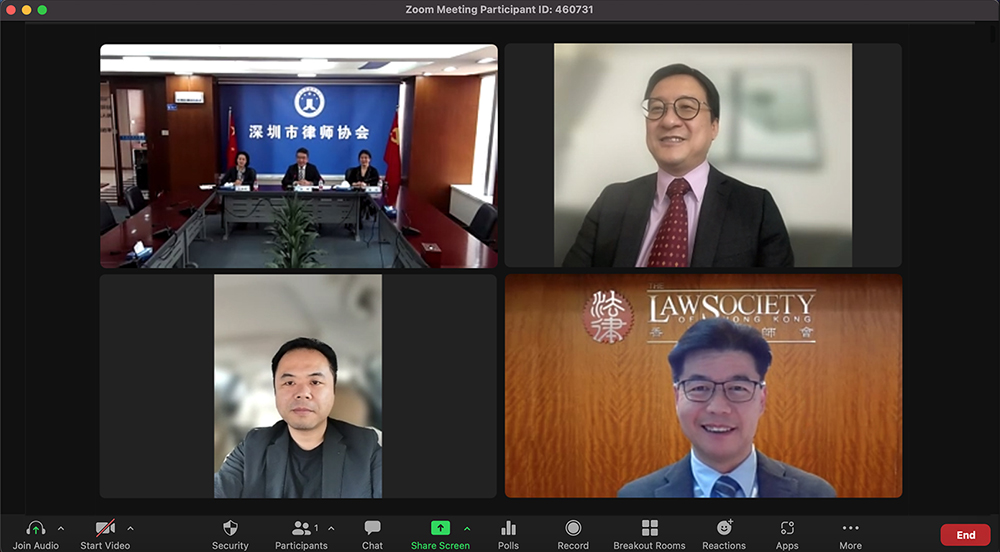 香港律師會會長陳澤銘律師與副會長暨大中華法律事務委員會主席湯文龍律師於3月4日與深圳市律師協會進行線上禮節會面,探討深港兩地律師如何善用跨境優勢加強合作。